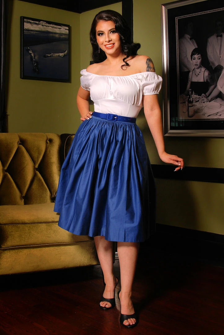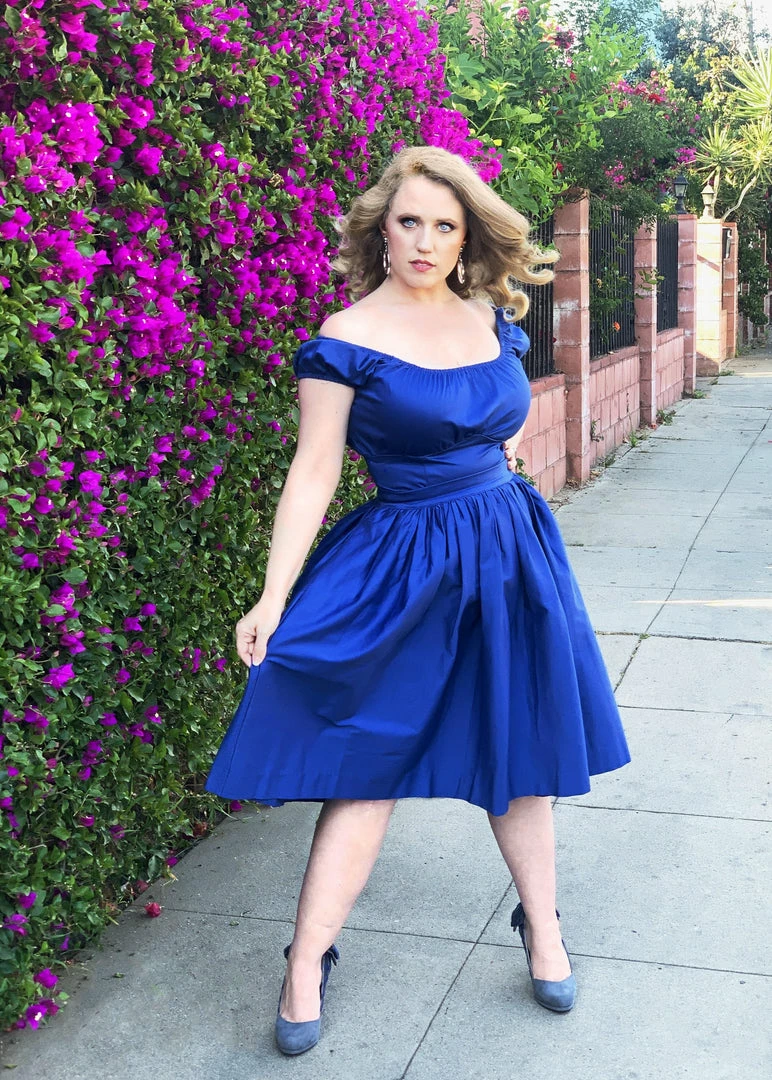 Bella Vintage Gathered Swing Skirt With Pockets In Solid Royal Blue Sateen | Pinup Couture