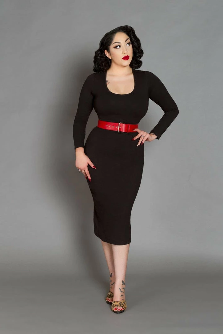 The Hannah Wiggle Dress is made of scuba crepe, featuring a wide scoop neck, and full length sleeves. Designed to hug every curve while being endlessly comfortable, and perfectly cool in hot weather.