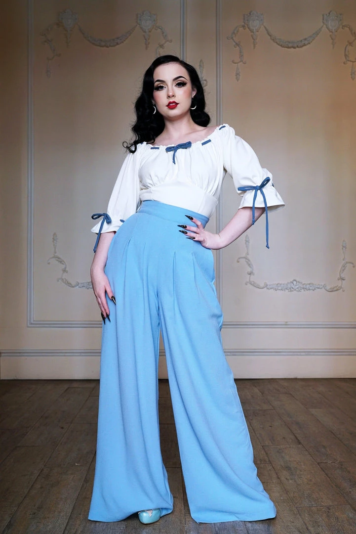 A perennial customer favorite due to the beautiful fit and silhouette they provide coupled with unparalleled comfort, these wide leg vintage inspired palazzo pants are made from a high quality poly/spandex stretch pebble crepe that drapes beautifully from tailored pleats. The waistband has elastic at back (on either side of the zipper) for a snug, yet comfortable fit at the waist, and there are deep side pockets. Fully lined.