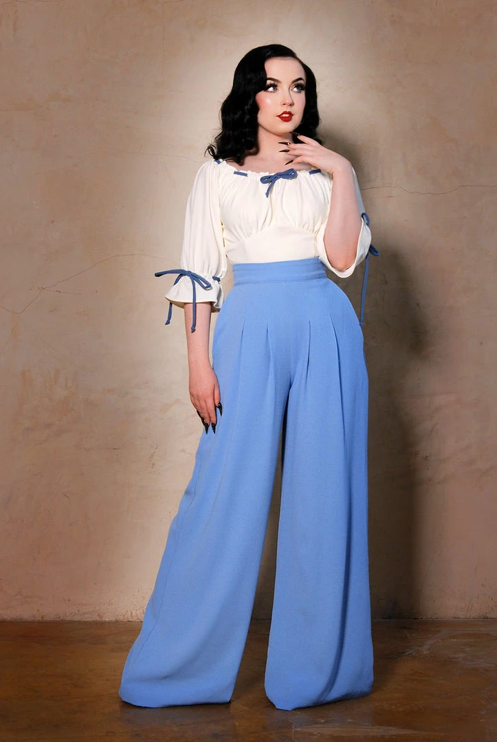 A perennial customer favorite due to the beautiful fit and silhouette they provide coupled with unparalleled comfort, these wide leg vintage inspired palazzo pants are made from a high quality poly/spandex stretch pebble crepe that drapes beautifully from tailored pleats. The waistband has elastic at back (on either side of the zipper) for a snug, yet comfortable fit at the waist, and there are deep side pockets. Fully lined.