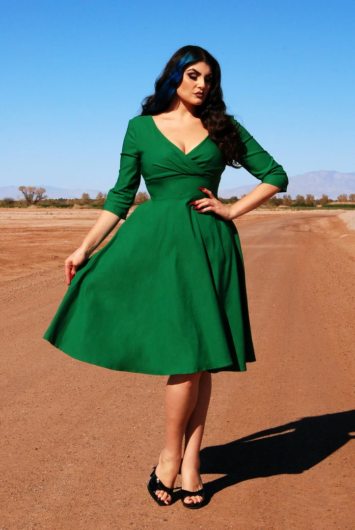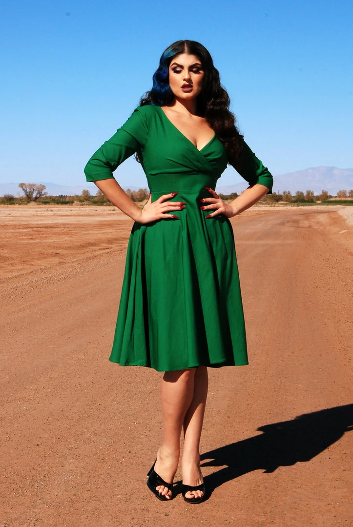 Made with soft and stretchy bengaline fabric, this style offers a slightly gathered cross-over style bust, a back zip, and three-quarter length sleeves for a cool weather-friendly look. Plus, its flattering swing skirt offers up every modern gals favorite feature, pockets. We suggest pairing with the matching Belt.