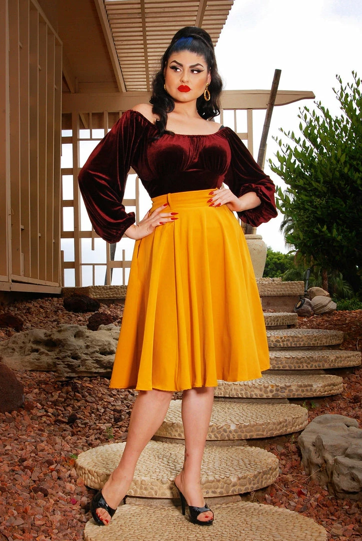 The Doris skirt is a elegant swing skirt with a full sweep and no gathers or pleats. However, it’s the 21st century, so this skirt has deep pockets. Designed as a callback to the true circle skirts of the 1950’s, It has a nipped in waistband, a back zipper, deep pockets, and loops for a wide belt. Made from stretch gabardine.Â