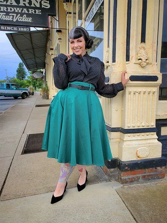 The Doris skirt is a elegant swing skirt with a full sweep and no gathers or pleats. However, it’s the 21st century, so this skirt has deep pockets. Designed as a callback to the true circle skirts of the 1950’s, It has a nipped in waistband, a back zipper, deep pockets, and loops for a wide belt. Made from the highest quality, heavyweight cotton sateen. If you’re looking for that added oomph under, we suggest our Twill Underskirt.