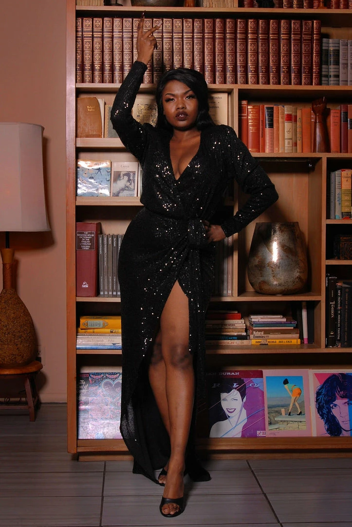 Reign supreme in the Dynasty Sequined Wrap Gown in Black. This sexy sequined piece has a black-liner for comfort and shoulder pads for an added va-va-voom! The snap-in enclosure provides an ease of putting on and removal. Complete the look with the Vintage Rhinestone Earrings in Pearlescent White.