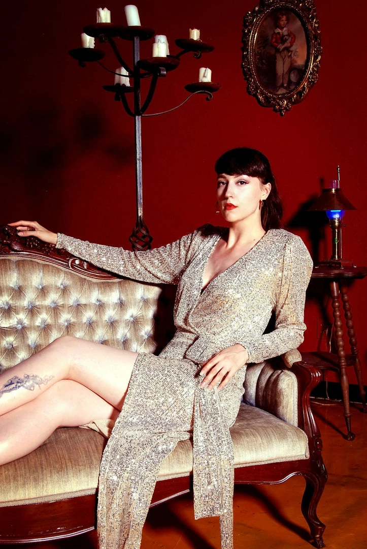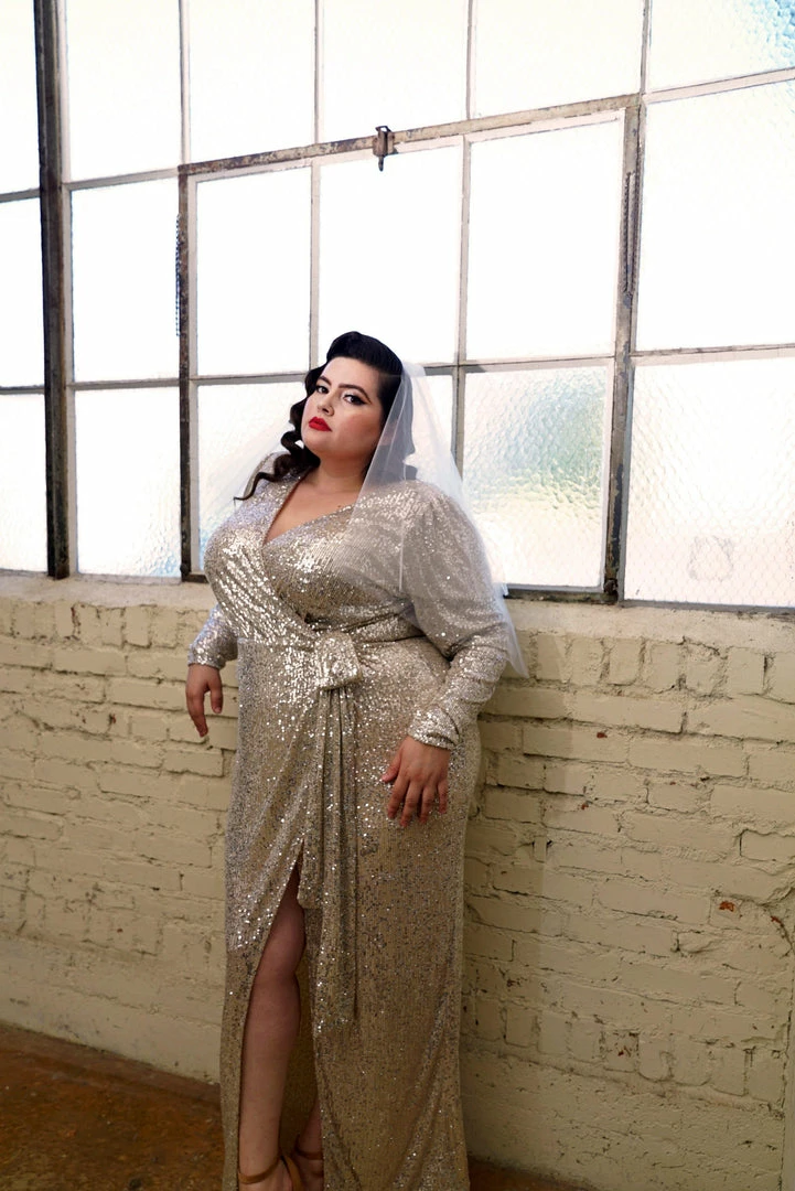 Reign supreme in the Dynasty Sequined Wrap Gown in Champagne Gold. This sexy sequined piece has a nude-liner for comfort and shoulder pads for an added va-va-voom! The snap-in enclosure provides an ease of putting on and removal. Complete the look with the Vintage Rhinestone Earrings in Pearlescent White.