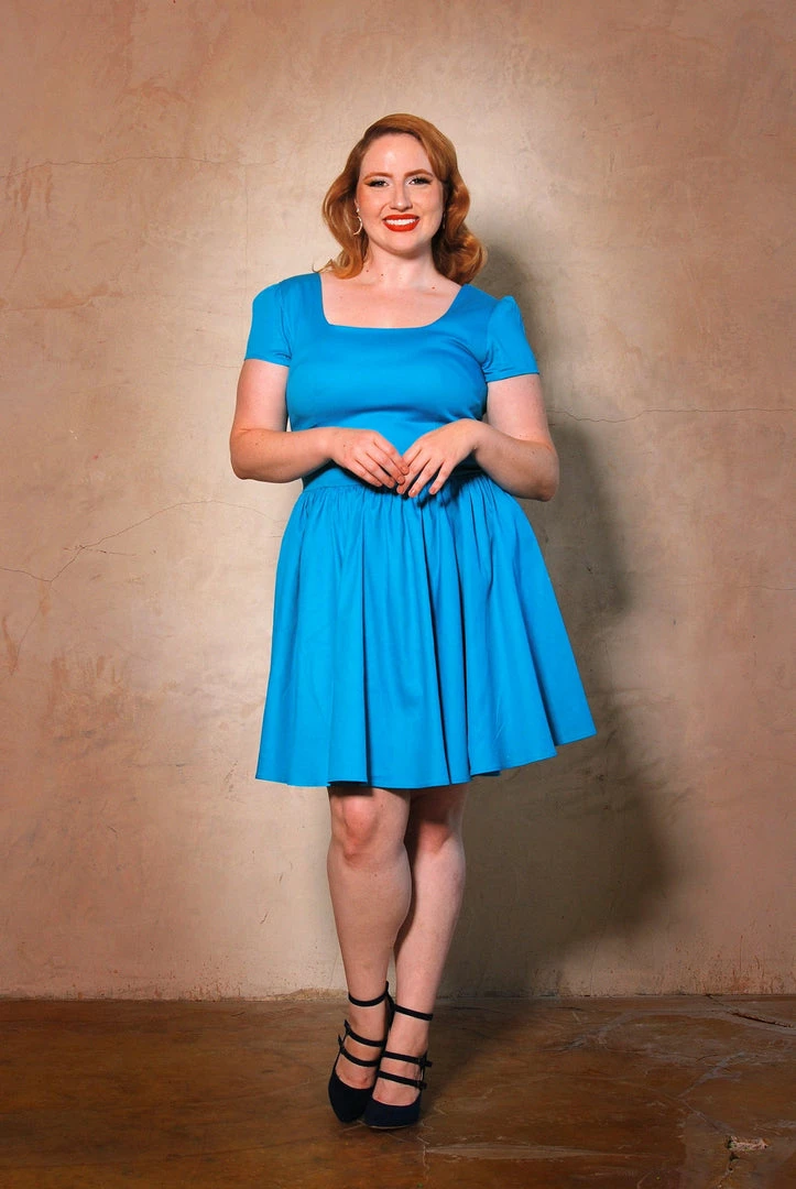 The Lara Dress in Layered Roses is made from the highest quality 97% cotton, 3% spandex cotton sateen and features a fitted bodice, and gathered petite length full skirt with deep pockets.
