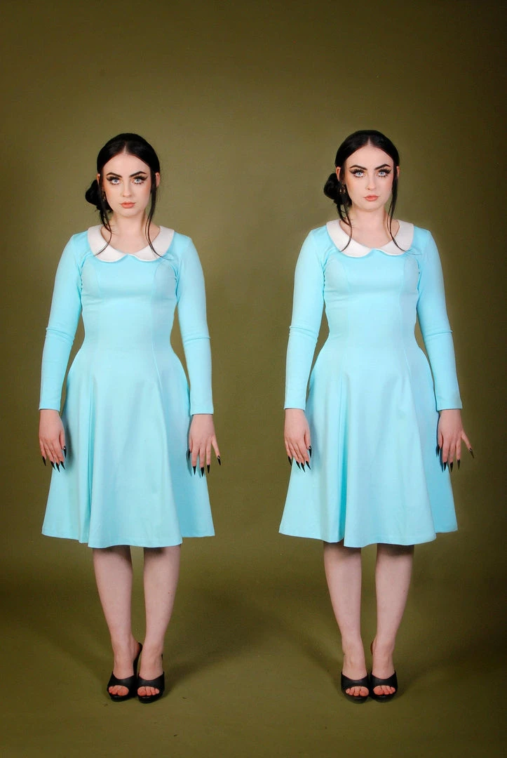 The perfect mid length day dress, the Madison Dress from Pinup Couture is made from the highest quality rayon blend Ponte de Roma and features long sleeves, a fit-and-flare silhouette, and an adorable contrast Peter Pan collar. 1″ faux leather belt sold separately.