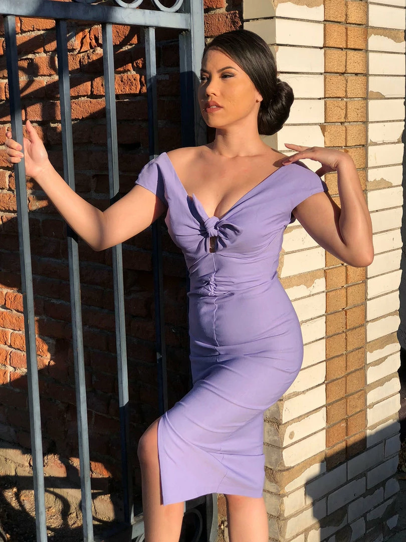 This is the ultimate sex kitten wiggle dress. The Niagara Dress in Lavender is made from a high quality, soft stretch bengaline that feels wonderful and hugs your curves perfectly. Featuring an almost off-the-shoulder neckline with cap sleeves that sit just on the top of your arms for a sexy flash of flesh and a tie front detail with a sassy, eye catching cut out – adjustable to comfortably fit a range of bust sizes. The Niagara has a fitted silhouette and a gathered detail down the center front of the dress that gives way to a very sexy front slit. Pictured here with the Hepburn Vintage Platform Sandals.