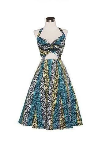This gorgeous vintage inspired swing dress from Pinup Couture features a gathered bodice that’s structured enough that in many cases, a bra is not needed, has deep pockets, adjustable shoulder straps, and a-line skirt, and a cute cutout at center bodice.
