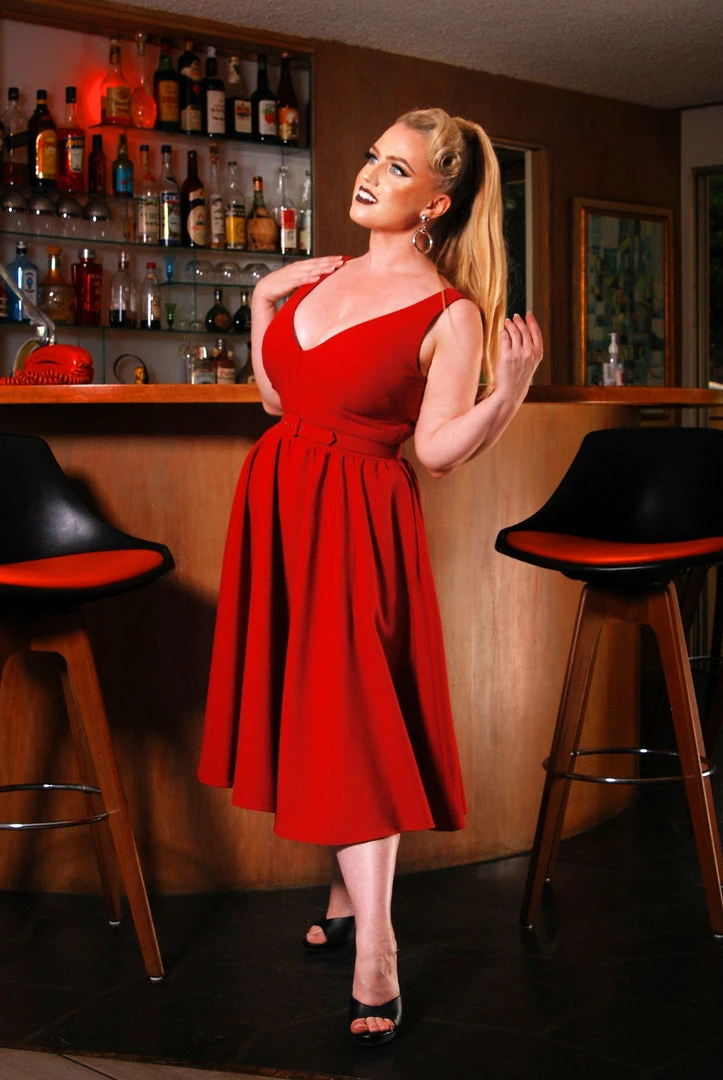 The Tara Dress is made from light and breathable poly crepe, and features a wide v-neck bodice that is modest yet incredibly flattering. The full circle skirt features deep side pockets. Back zip.