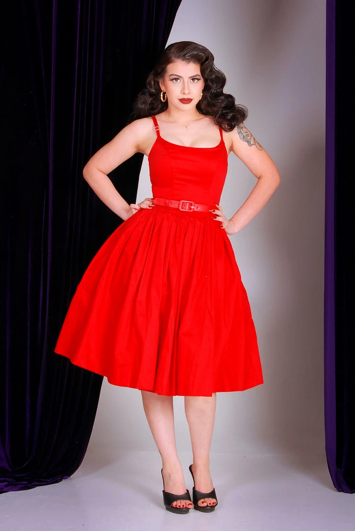 Inspired by an early 1960s sundress design, our classic Jenny Dress is a flirty full skirted, retro dream with a bodice that is boned and fused throughout. This gives your bust amazing structure while beautifully cinching your waist in. The straps are adjustable to accommodate a large range of bust sizes, no matter if you’re smaller or fuller in that area. The Jenny Dress is now considered a Pinup Girl favorite, as it gives you the effortless option of wearing it to work with a cardigan or transitioning to effortless drama for cocktail hour. Made in our beautifully luxe cotton sateen which breathes as you wear it, but will not lose its shape giving you wear for years to come. This dress has a full gathered skirt with deep side pockets and is finished off with a long back zip.