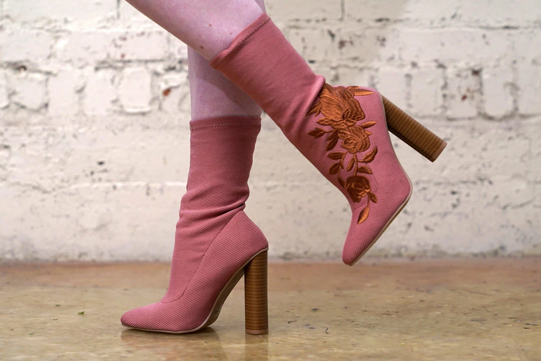 Hot Issue Fashion – FashionGo Shop All In-Stock Items By Size Final Sale – Flora Embroidered High Heel Booties In Rose