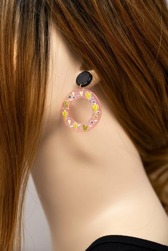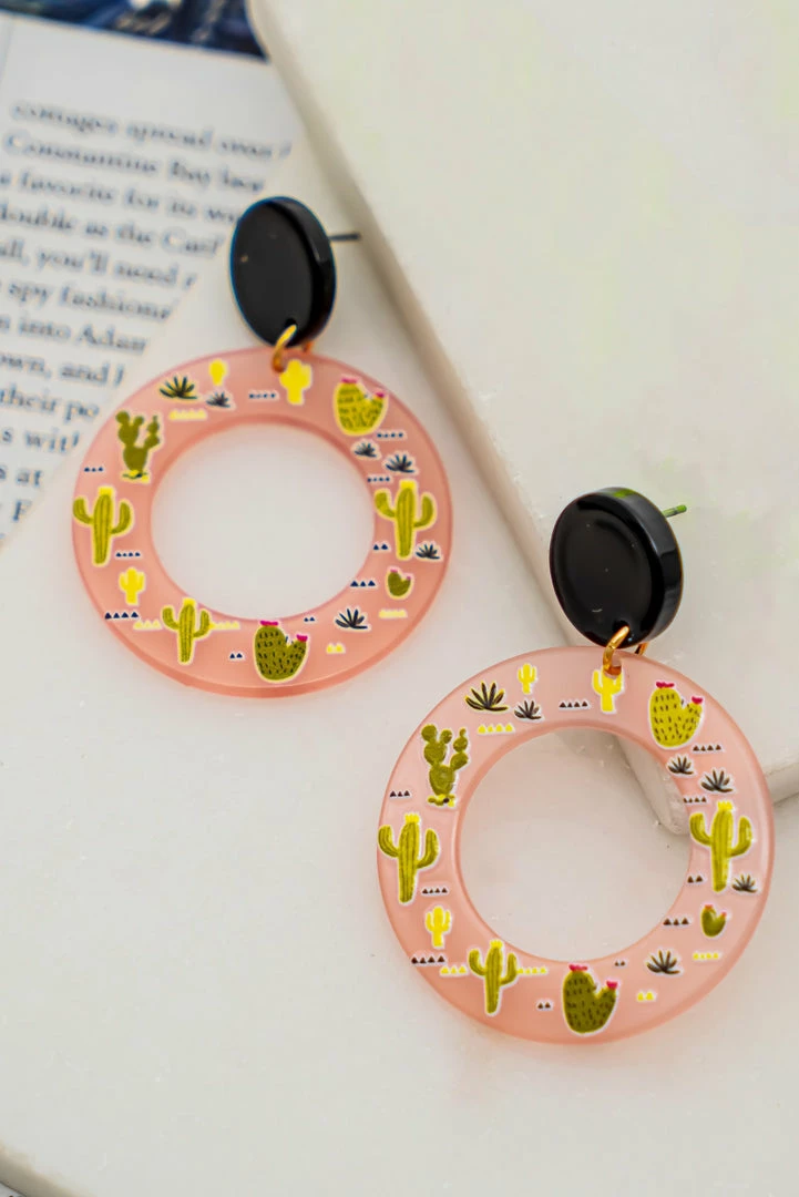 Acrylic hoop drop earrings with with delicate desert scenery.
