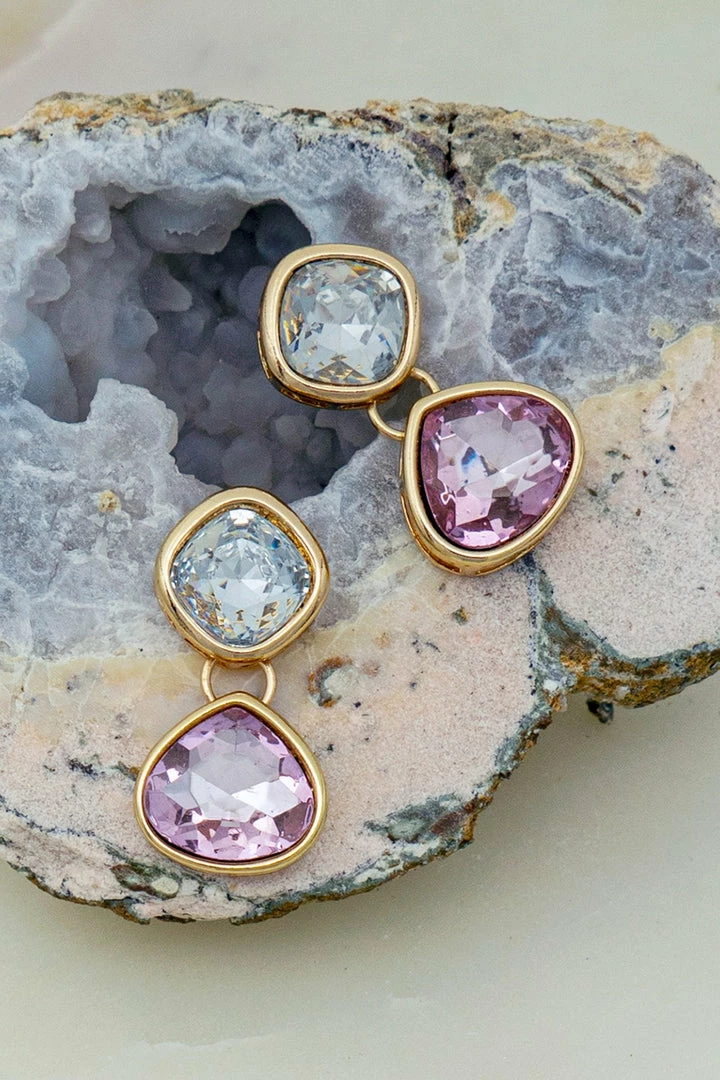 Rhinestone drop earrings featuring delicate square clear stones and pink teardrop stones.
