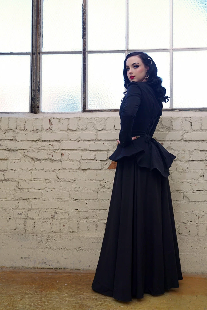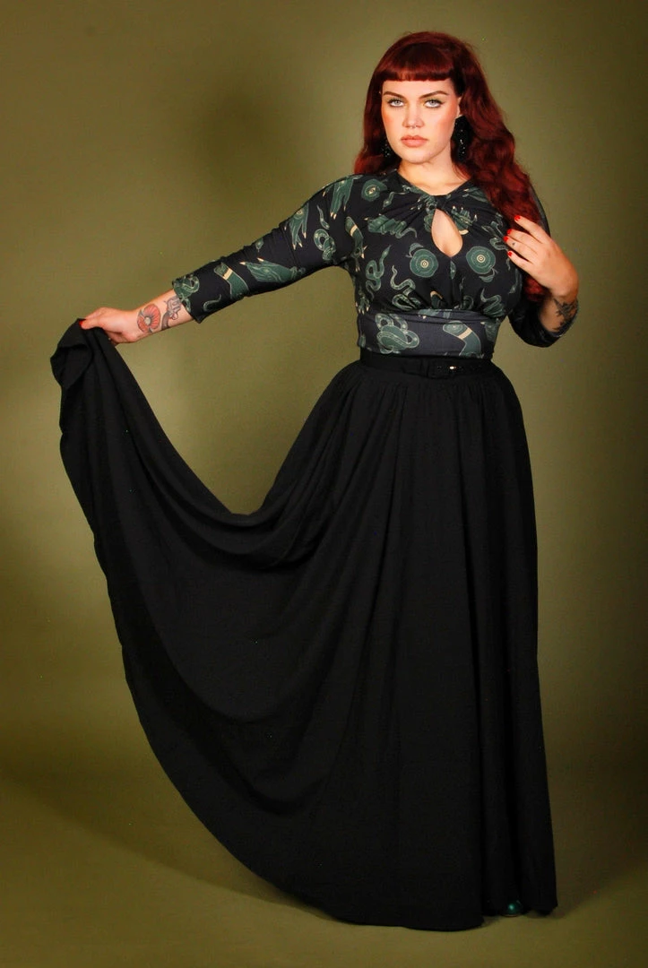 This gathered maxi skirt is fully lined with a back zip and the deep pockets you can expect from Pinup Girl Clothing. Perfect for spring and summer with its poly/spandex crepe material.Â