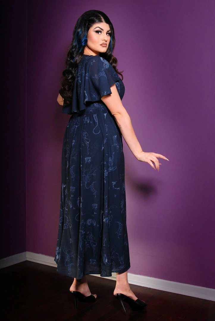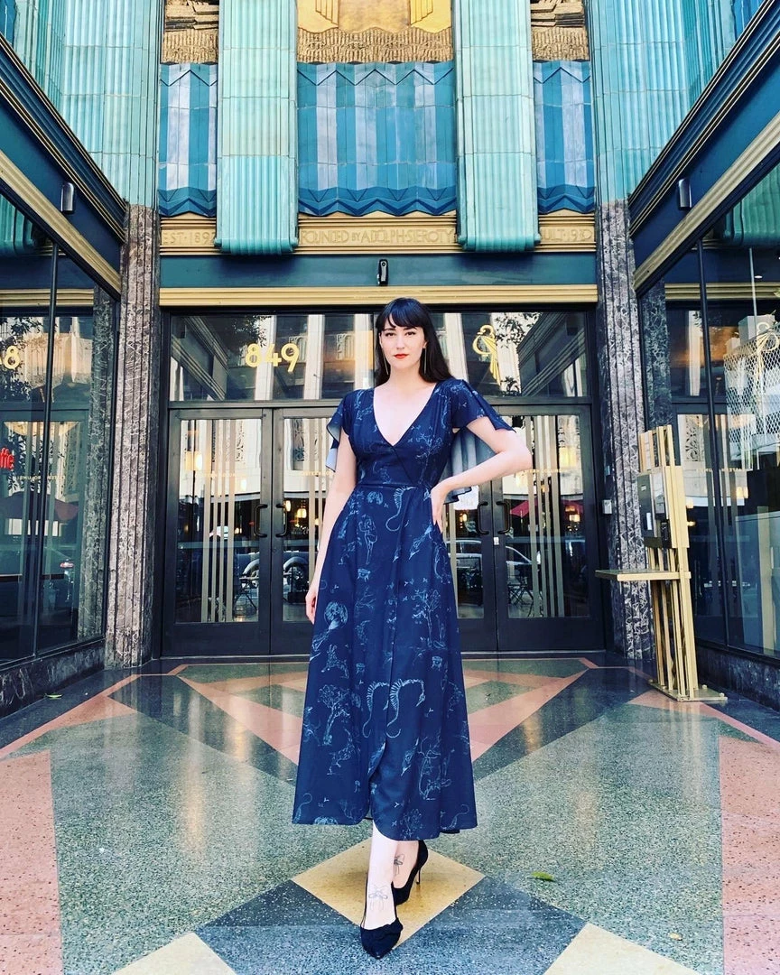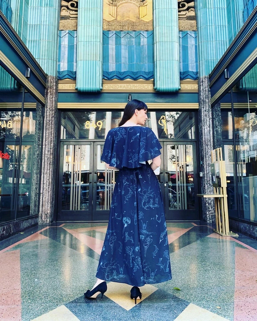 The Ashley is a 70’s inspired faux wrap maxi that features cascading cape sleeves, a v-neck bodice, and elasticized waist, and an a-line maxi skirt with deep pockets and gathers at back. Fully lined, with a back zip. Constructed from a 95% poly 5% spandex stretch crepe.