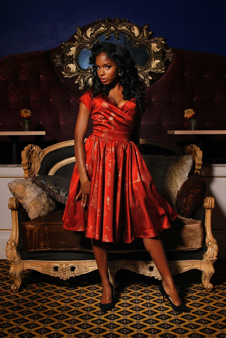 Re-imagined as a party-perfect swing dress, the Ava Swing Dress has the same modest-but-alluring crossover bustline as its tulip-skirted sister, but with a full swing skirt begging to twirl around in. Made with luxurious satin, you can bring a little something special to your next event with Ashley Urban’s burgundy and gold Witchy Toile textile design.Â