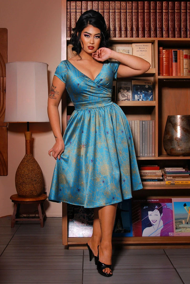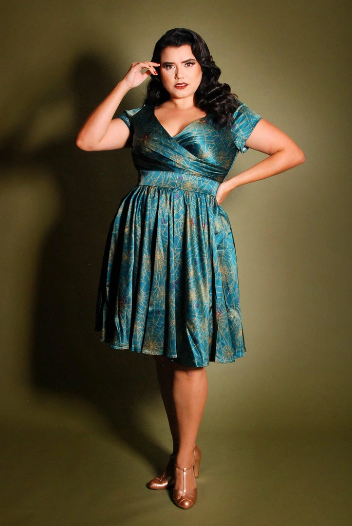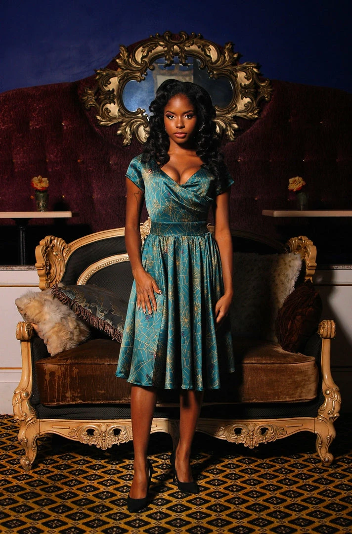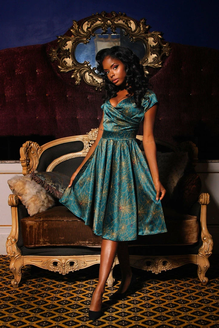 Re-imagined as a party-perfect swing dress, the Ava Swing Dress has the same modest-but-alluring crossover bustline as its tulip-skirted sister, but with a full swing skirt begging to twirl around in. Made with luxurious satin, you can bring a little something special to your next event with our teal and gold spiderweb fabric.