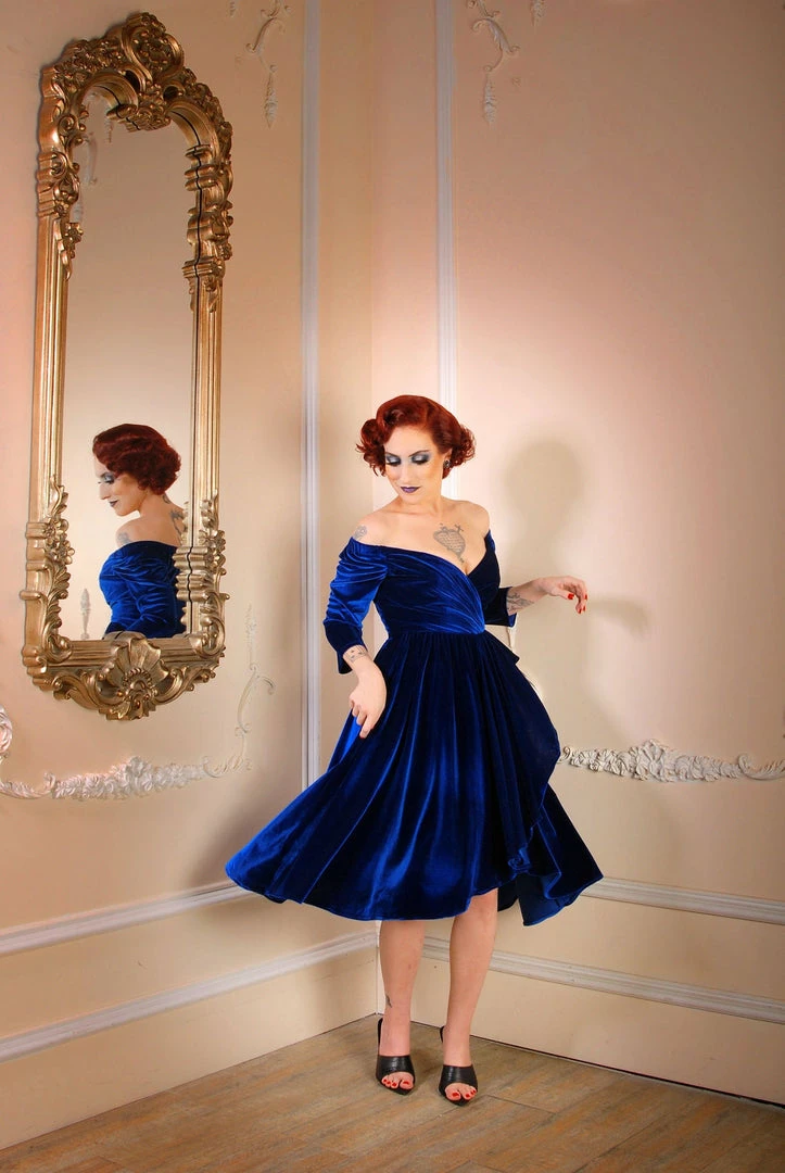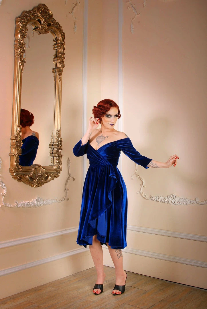 Inspired by our best-selling Monica wiggle, her sister is a swinging good time in the most sumptuous velvet you ever did see. The beautiful crossover bustline features soft, clear elastic that allows the sleeves to sit slightly off-shoulder for ultimate romance, but may also be worn comfortably on-shoulder. The Monica Swing includes our signature built-in stretch Bengaline shaper at the bust for support and structure while the gathered, faux wrap skirt flutters effortlessly. The result is a sweet but sexy swing dress that will have you turning heads all through the holidays.Â