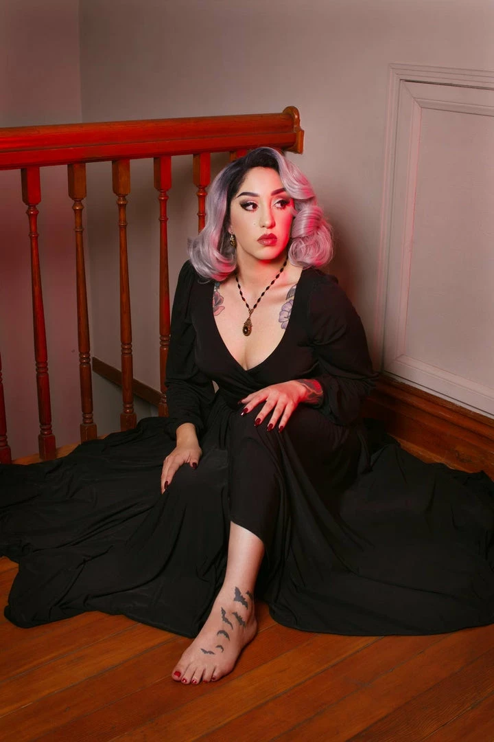 Everyone has a dark side and this dress allows you to wrap yourself up in it. The Ponte Robe Dress is an exquisitely designed garment. It has a plunging crossover neckline with a single button closure on the inside and three buttons on the outside of the ponte waistband. Completely crafted in decadently soft ponte, the robe dress has soft, feminine draping from waist to hem while the sleeves are puffed out for a seductive vintage touch. Disarming, charming and enthralling, wear this dress and you’ll cause chaos wherever you go.