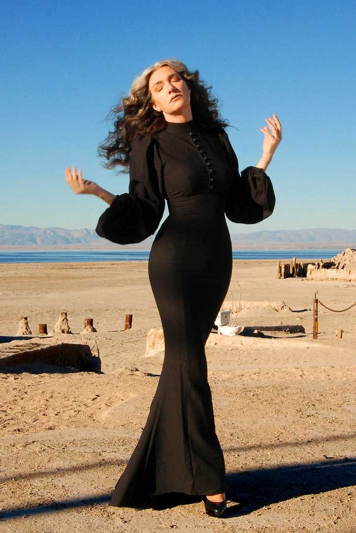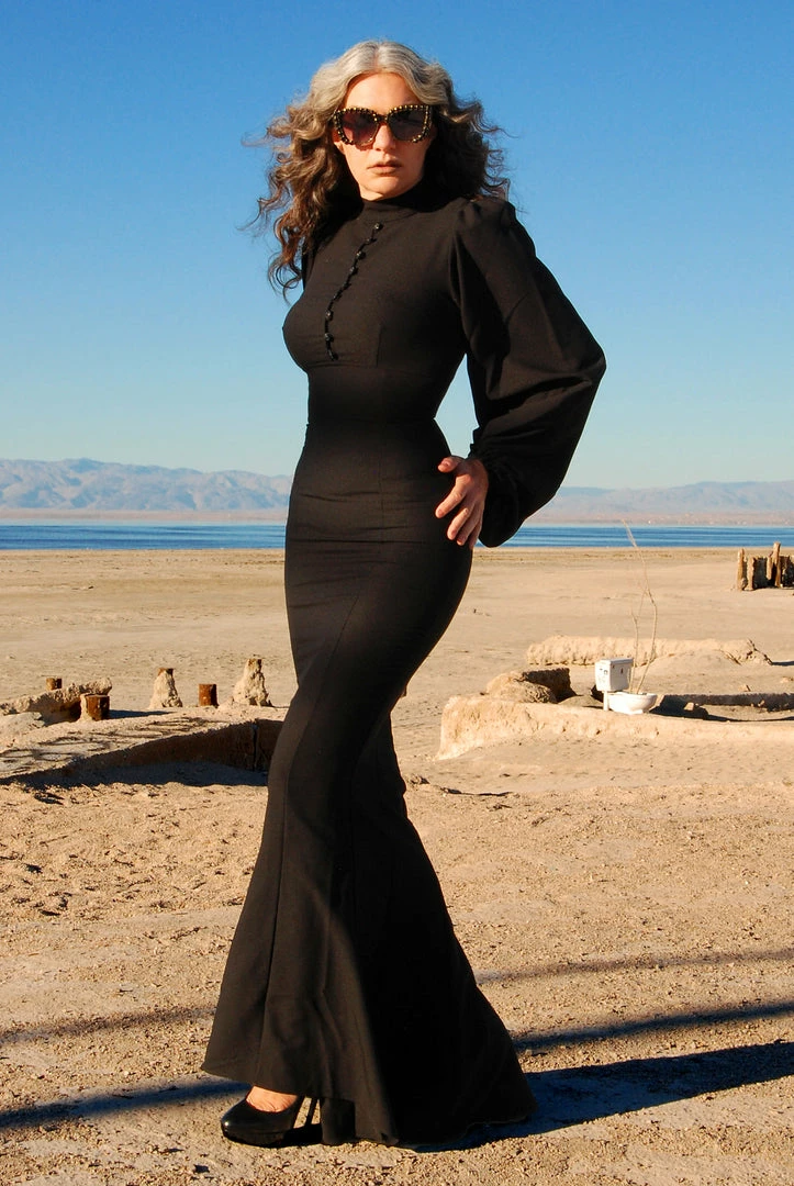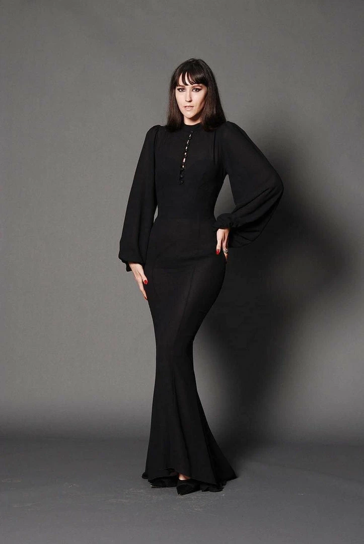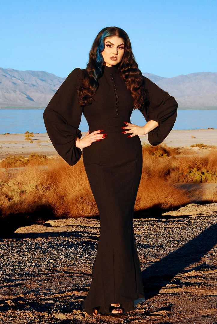 Slip into something a little wicked with the Serafina maxi gown. Featuring a row of buttons that accent a high collar, dramatic bishop sleeves to ensure all eyes stay on you, and a slight fishtail train to ensure your rear view is just as memorable as your entrance!