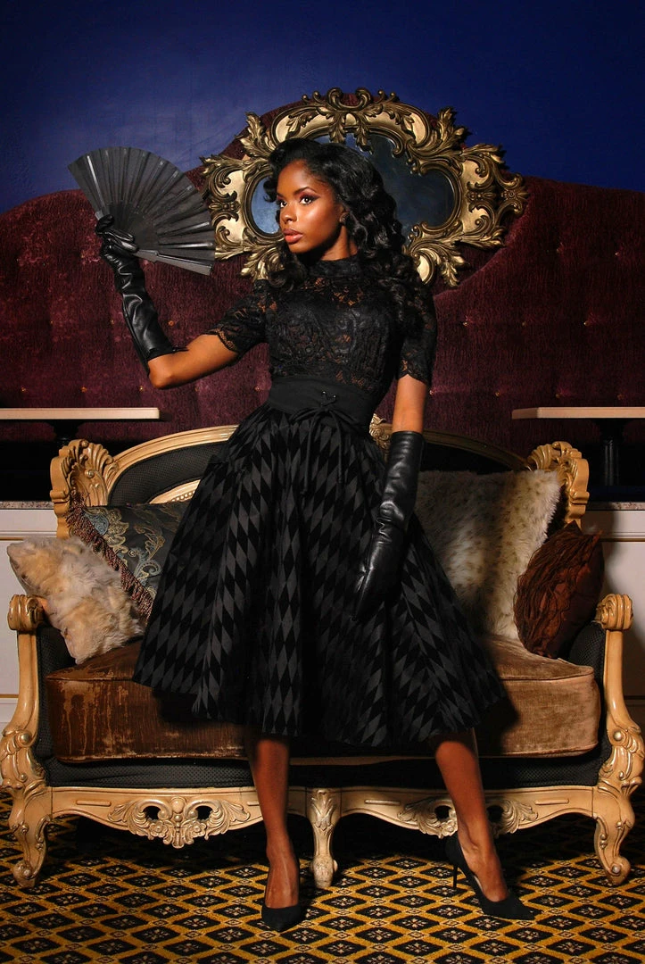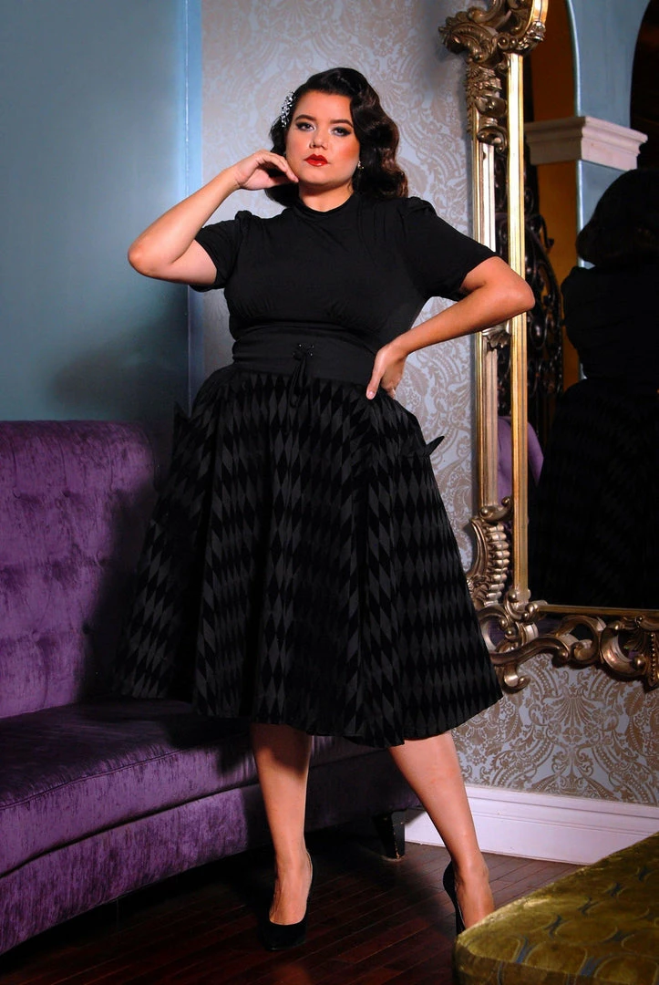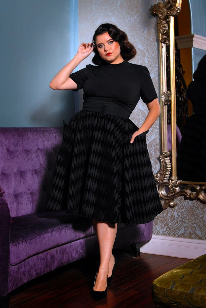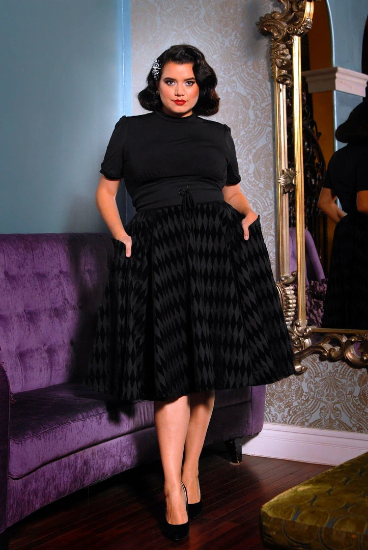 This gorgeous vintage inspired Corset skirt features a defining waistband with a tie detail, and pockets that are deep enough to carry all your tricks and treats, as well as your lipstick and a mirror. The full sweep of the skirt is perfect for twirling on thru the cemetery or being fluffed up via the exclusive Laura Byrnes California Canvas Underskirt. Dress it up with a Mock Neck top for work, or pair with our Morgana Jacket in Black Twill for maximum drama. Made from the highest quality stretch cotton sateen, in a beautifully black flocked harlequin print, this skirt will quickly become one of your fashion favorites.
