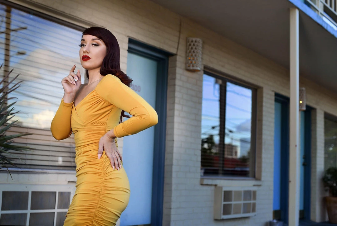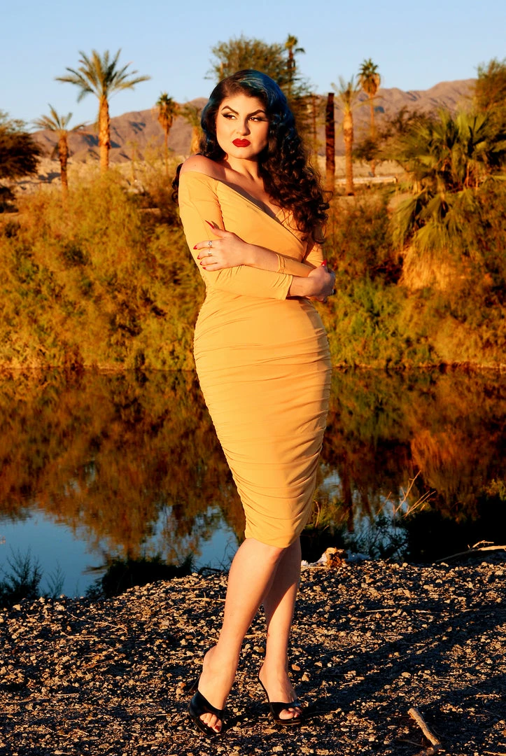 The Monica is a wonder of a wiggle! With a design inspired by the sexy gathered wiggle dresses of mid-century Hollywood, the beautiful crossover bustline features soft, clear elastic to hold the jersey to your skin and allows the sleeves to sit slightly off-shoulder – and may also be worn comfortably on-shoulder. The fabric is a unique matte knit that will not pill, resists wrinkles, and has beautiful drape and stretch. A built-in stretch Bengaline shaper for the bust, waist, and lower hip gives support, structure, and holds you in, while being surprisingly comfortable, while the gathered outer fabric disguises the internal structure and gives you a sleek and clean hourglass silhouette. The result is an incredibly sexy and attention grabbing wiggle dress with the structure to have you looking your best while stopping traffic and breaking hearts.