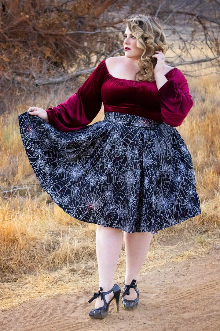 Made out of the highest quality 97% cotton 3% spandex cotton sateen, this vintage inspired skirt features an a-line silhouette, box pleating in the skirt, and an elasticized waistband at the back. Finished off with a back zip, and featuring deep pockets at the side seams. Skirt measures 21″ with a 3″ curved waistband.