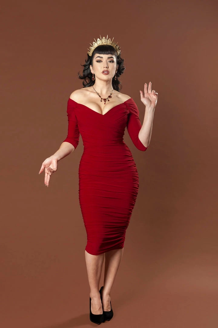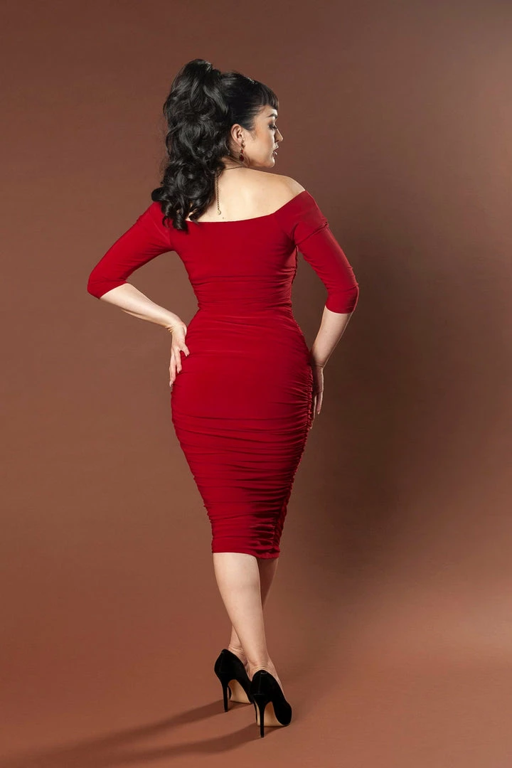 The Monica is a wonder of a wiggle! With a design inspired by the sexy gathered wiggle dresses of mid-century Hollywood, the beautiful crossover bustline features soft, clear elastic to hold the jersey to your skin and allows the sleeves to sit slightly off-shoulder – and may also be worn comfortably on-shoulder. The fabric is a unique matte knit that will not pill, resists wrinkles, and has beautiful drape and stretch. A built-in stretch Bengaline shaper for the bust, waist, and lower hip gives support, structure, and holds you in, while being surprisingly comfortable, while the gathered outer fabric disguises the internal structure and gives you a sleek and clean hourglass silhouette. The result is an incredibly sexy and attention grabbing wiggle dress with the structure to have you looking your best while stopping traffic and breaking hearts.