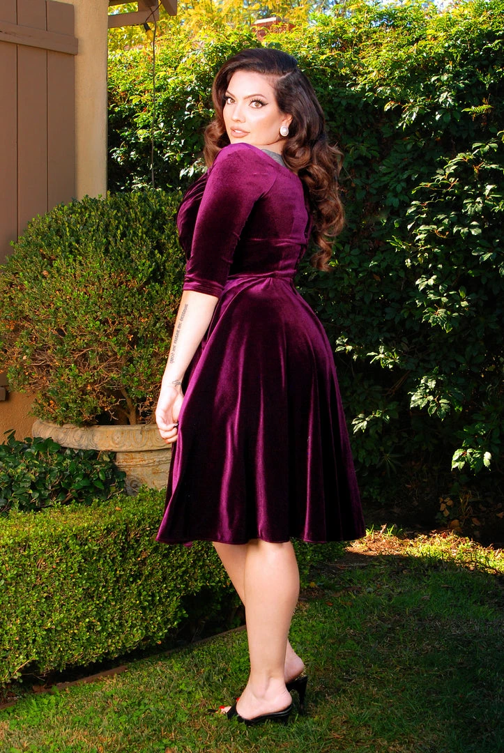 Inspired by our best-selling Monica wiggle, her sister is a swinging good time in the most sumptuous velvet you ever did see. The beautiful crossover bustline features soft, clear elastic that allows the sleeves to sit slightly off-shoulder for ultimate romance, but may also be worn comfortably on-shoulder. The Monica Swing includes our signature built-in stretch Bengaline shaper at the bust for support and structure while the gathered, faux wrap skirt flutters effortlessly. The result is a sweet but sexy swing dress that will have you turning heads all through the holidays.Â