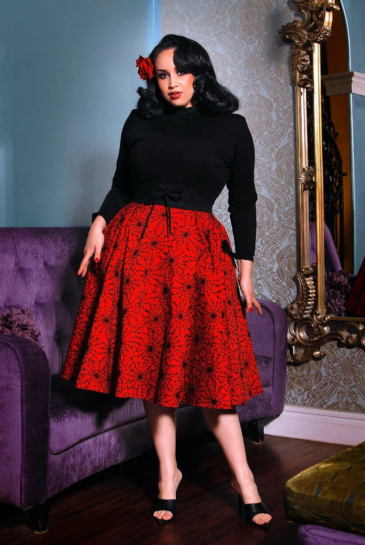 This gorgeous vintage inspired Corset skirt features a waist defining, contrasting waistband with a tie detail, and pockets that are deep enough to carry all your tricks and treats, as well as your lipstick and a mirror. The full sweep of the skirt is perfect for twirling on thru the cemetery or being fluffed up via the exclusive Laura Byrnes California Canvas Underskirt. Dress it up with a Peasant Top for work, or pair with our Morgana Jacket in Black Twill for maximum drama. Made from the highest quality stretch cotton sateen, in a beautifully spooky red & black flocked spider web print, this skirt will quickly become one of your fashion favorites.