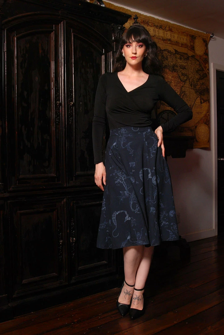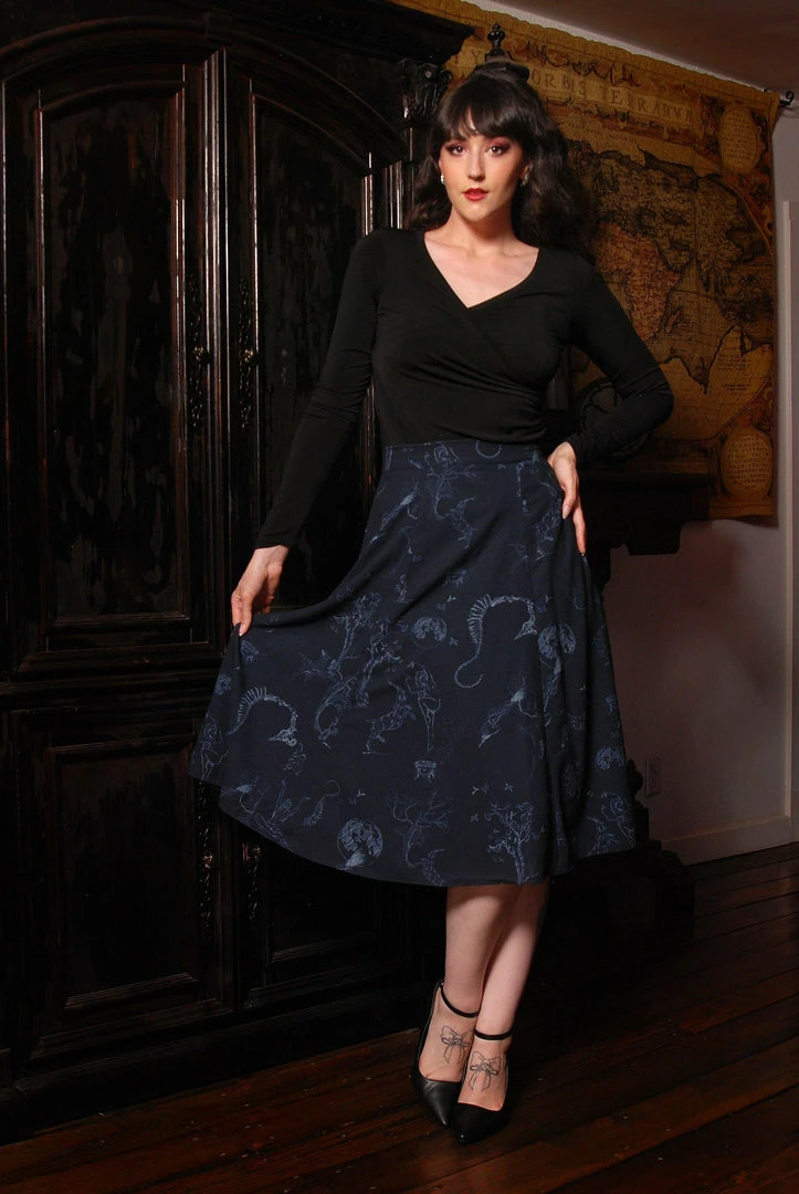 A triumph of graceful beauty, the Viva Skirt takes the sleek clean lines of the 1940s and transforms them into elegance that enchants and enhances beyond compare. Made with vintage-style poly crepe fabric in an original witchy toile design, this lined skirt features a fit and flare silhouette with a back zip.