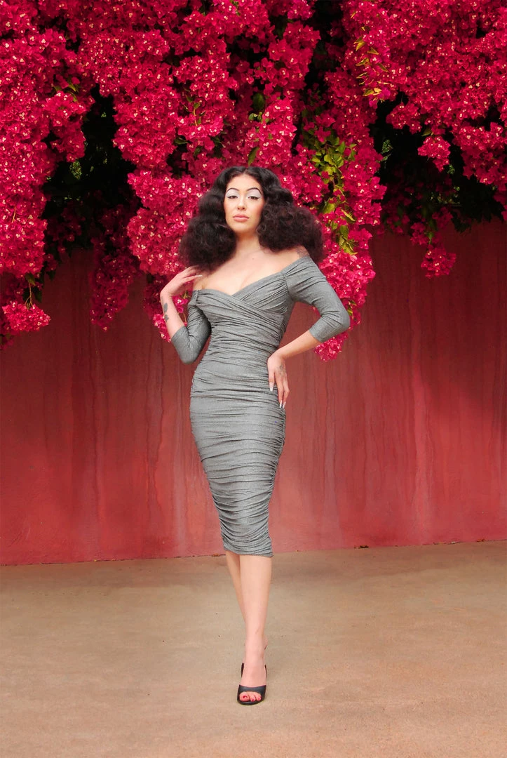 The Monica is a wonder of a wiggle! This seductive number features a beautiful crossed over bust line with clear elastic to hold it to your skin yet still allows the sleeves to sit slightly off-shoulder. The fabric is a unique matte knit of the highest quality that will doesn’t pill, resists wrinkles, and has a gorgeous drape and stretch. A built-in stretch Bengaline shaper for the bust, waist, and lower hip gives support, structure, and holds you in, while the gathered outer fabric disguises the internal structure and gives you a sleek silhouette. The result is a sexy, attention grabbing wiggle dress that will not only have you looking your best, but feeling your best.