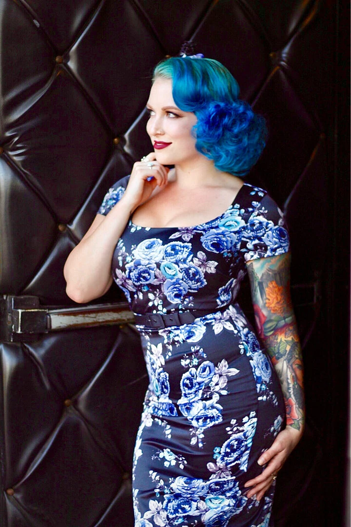 Size OYS Laura Wiggle Dress in Blue Roses Satin
