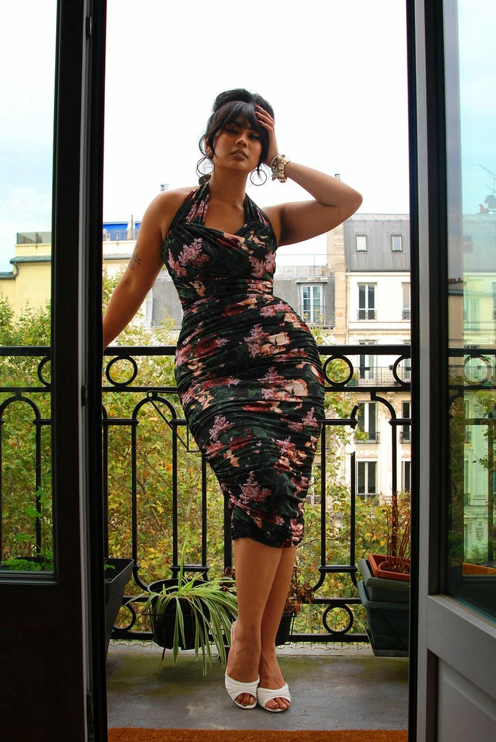This sexy, midcentury inspired wiggle dress was inspired by the eternally sexy Traci Lords. A stretchy dream girl of a dress, the beautiful crossover bustline provides extra room for the ladies and combined with the adjustable halter ties, provides enough foundation to give you the kind of power cleavage you’ve come to expect from Laura’s designs. Traci also has built in Bengaline shape wear below the bust to the mid thigh that gives support and structure while holding you in. The gathered fabric camouflages the internal structure and gives you a sleek and clean silhouette. The result is an incredibly sexy vintage inspired wiggle dress. The Traci Dress in Black will have you looking like a seductive goddess and feeling like a movie star.