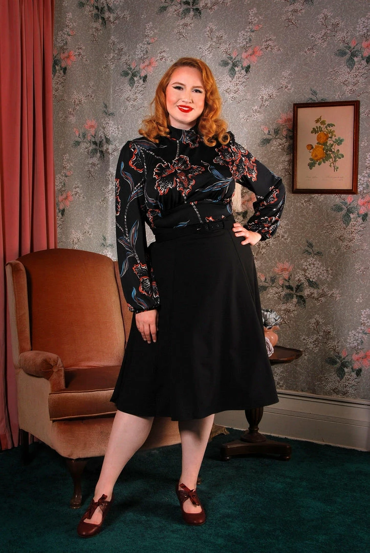 A triumph of graceful beauty, the Viva Skirt takes the sleek clean lines of the 1940s and transforms them into elegance that enchants and enhances beyond compare. Made with vintage-style poly crepe fabric, this lined skirt features a fit and flare silhouette with a back zip. Pictured here with the Ophidia Snake Buckle Belt in Green Vegan Leather. Complete the look with the Twisted Snake Soutache Earrings and the Eye of the Tiger Pin Striped Sunglasses in Olive.