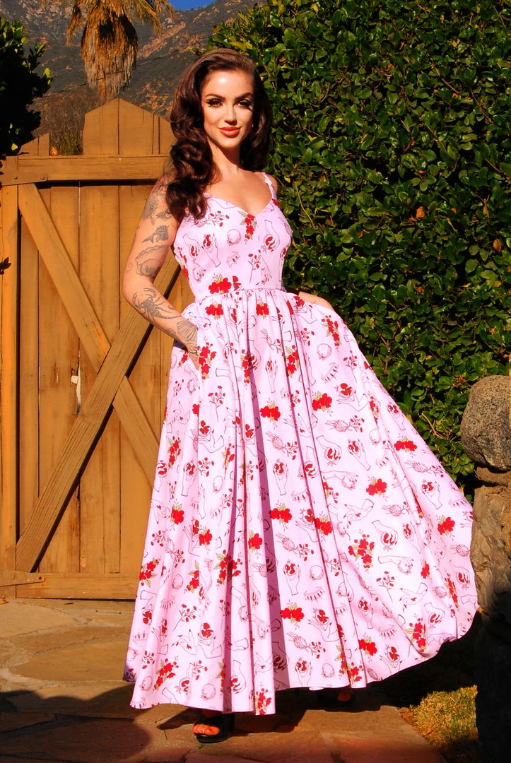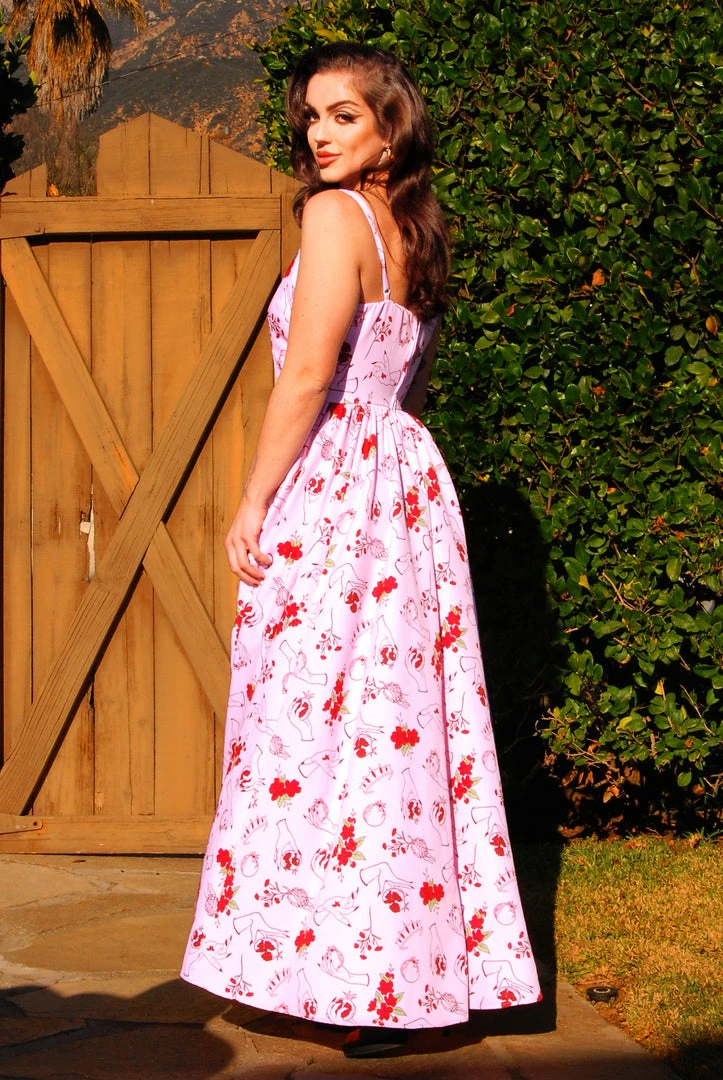 Featuring a 70’s inspired, fitted “ballerina” style bodice, adjustable spaghetti straps, and a gathered maxi skirt with deep pockets. Fully lined, with a back zip. Perfect for summer with its flowy poly/spandex crepe material. Our exclusive Spring Persephone print is a celebration of the power of femininity.