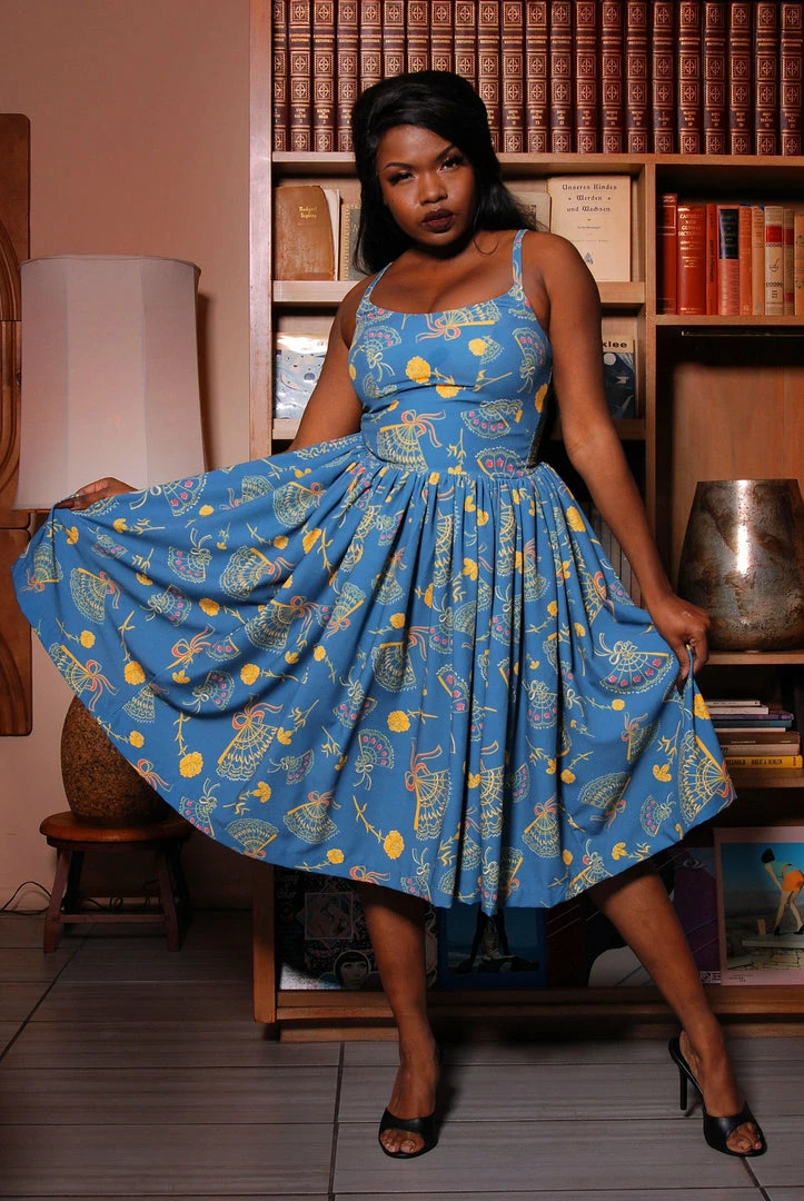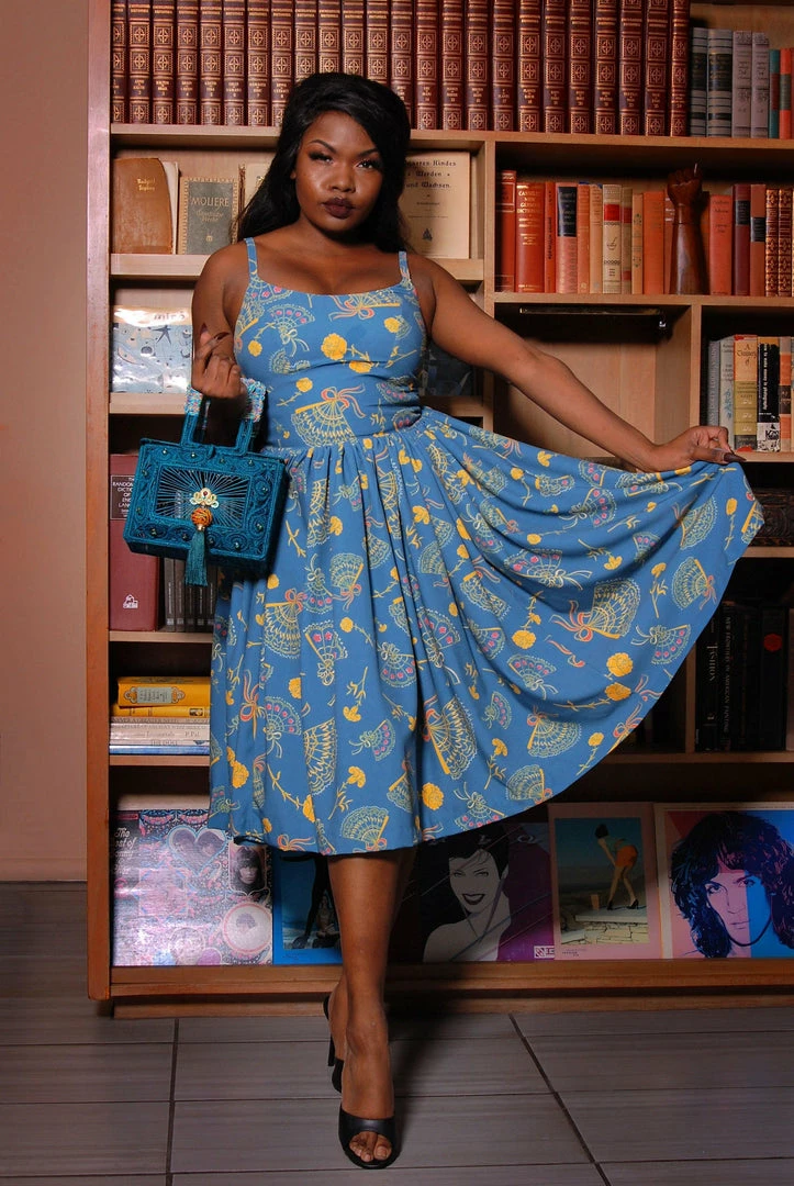 Inspired by an early 1960s sundress design, our classic Jenny Dress is a flirty full skirted, retro dream. The straps are adjustable to accommodate a large range of bust sizes, no matter if you’re smaller or fuller in that area. Now in our exclusive Spanish Fans print in teal by Hope Morrison on our beautiful poly crepe, a fabric that defies wrinkles. This dress has a full gathered skirt with deep side pockets and is finished off with a long back zip. This version of our classic does not have the bodice boning of the original design, and instead we have added a sculpting seam under the bust. Worn here with the Hot Girl Peep Toe Mule in Black Faux Leather, complete the look with any one of our gorgeous La Donna Folding Fans in a variety of colors.