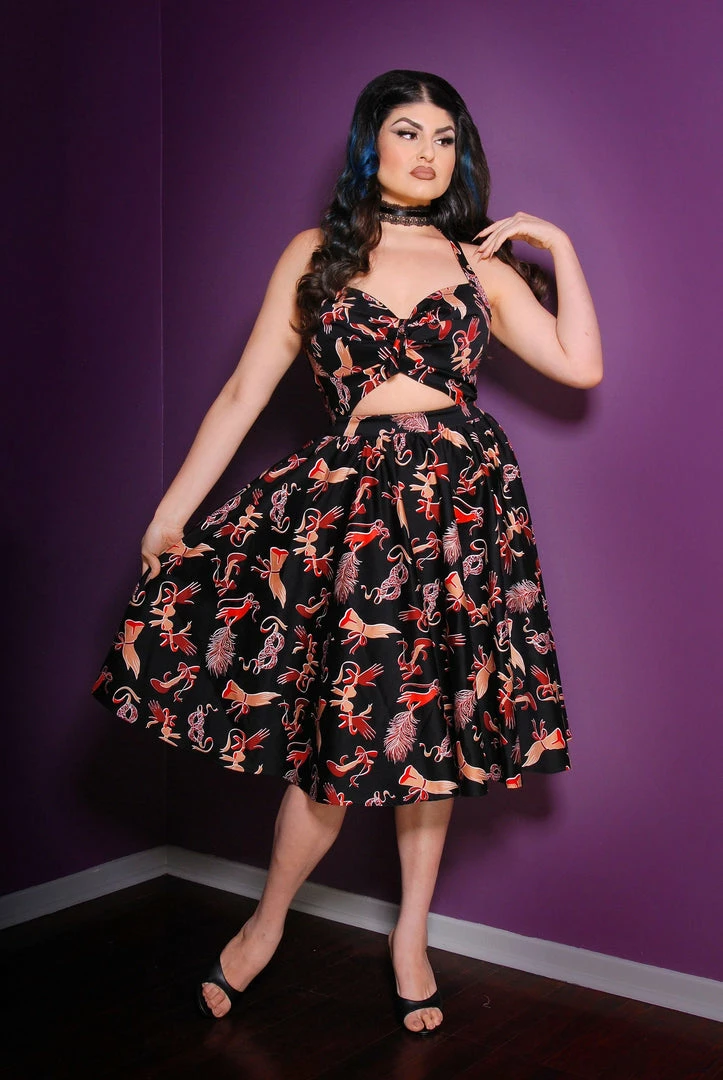This gorgeous vintage inspired swing dress from LBHM features a gathered bodice that’s structured enough that in many cases, a bra is not needed. The Renee is an A-line silhouette in cotton sateen, with adjustable shoulder straps, a cute cutout at the center bodice, and of course, deep pockets we all know and love! Now in our exclusive Tie Me Up print by Hope Morrison featuring flirtatiously fetish-inspired art that is not for the faint of heart. Complete the look with our Midnight In Paris Lace Choker in Black (or the Bad Girl Faux Leather Buckle Choker for extra spice) and The Hot Girl Peep Toe Mules in Black Faux Leather.