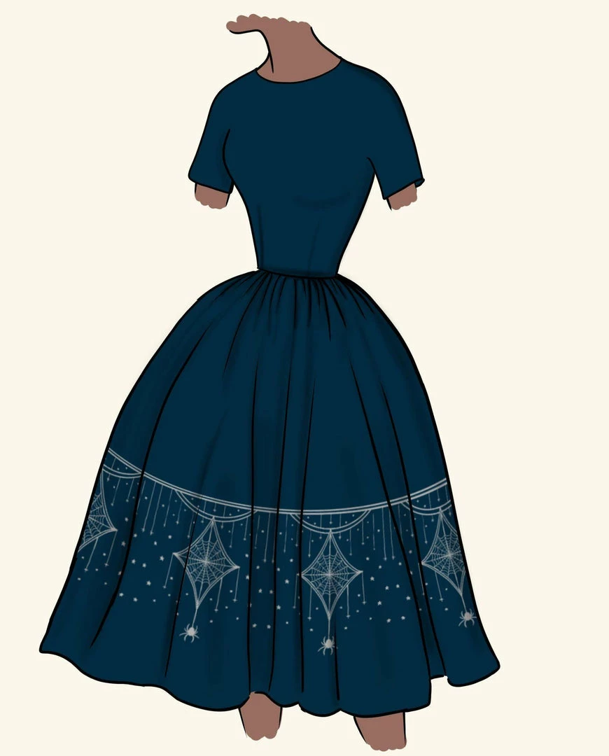The Kristina Dress in Blue & Silver Deco Spiderweb is made from the highest quality 97% cotton, 3% spandex cotton sateen and features a fitted bodice, and gathered full skirt with deep pockets.