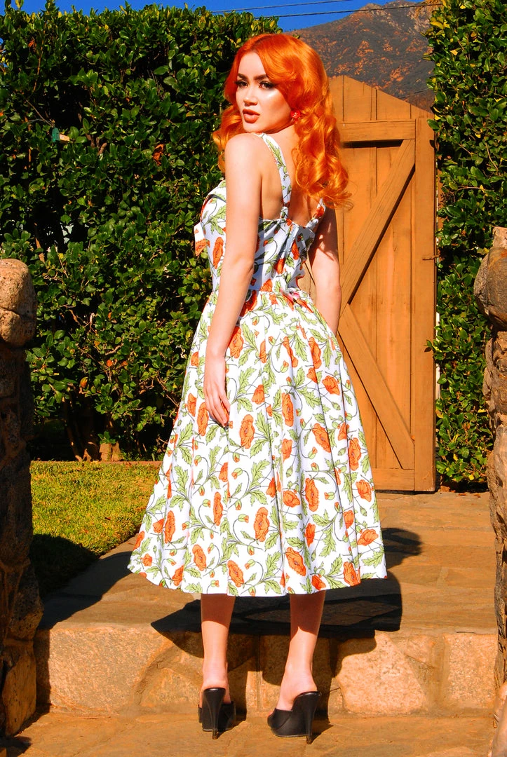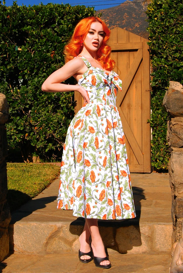 Meet Linda, your new favorite sundress with a little something extra special. The perfect blend of beauty and comfort, this dress is made from our breathable poly crepe, features an adjustable tie at the bust with keyhole detail, curve hugging seams, and is elasticized at the back with a full zip for extra all day ease of wear. And yes, she has pockets. Now available in our exclusive California Poppies print, featuring a twisting design of painted orange poppies on a field of soft blue part of our early spring 2022 collection celebrating Southern California.