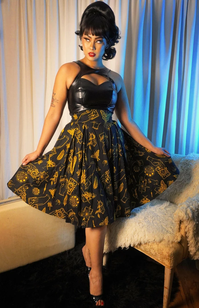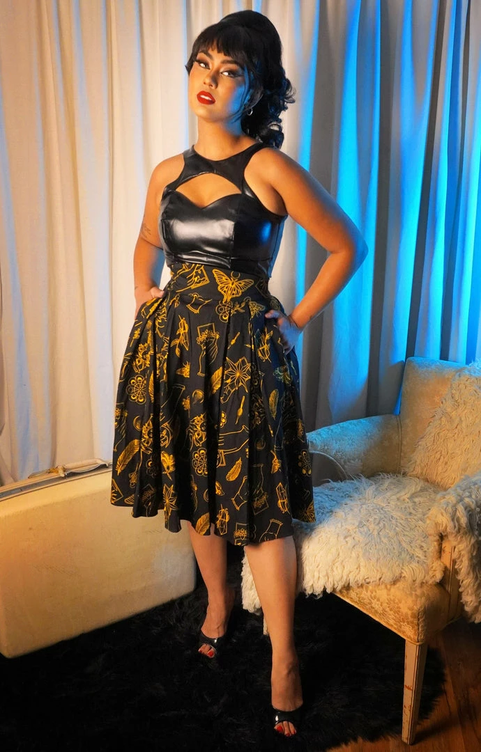 Made out of the highest quality 97% cotton 3% spandex cotton sateen, this vintage inspired skirt features an a-line silhouette, box pleating in the skirt, and an elasticized waistband at the back. Finished off with a back zip, and featuring deep pockets at the side seams.