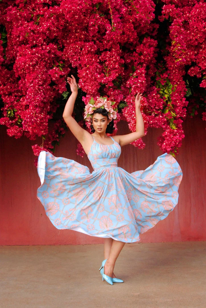 The quintessential vintage inspired sun dress now available in our exclusive Take Me To Versailles collaboration print by Hope Morrison. Featuring a flirty gathered bodice with adjustable shoulder straps with the back zip and a full circle skirt that’s perfect for twirling and traipsing through the garden. This new Ella is made from our lightweight poly crepe, lined, and is outfitted with functional side pockets for the Dauphine on the go.