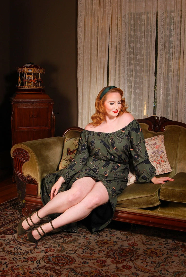 Fit for a true warrior. Created by designer Laura Byrnes and artist Hope Morrison, we present you the Sylvie Long Sleeve Peasant Top in our Garden of Eden Snake print. Unlined in a printed stretch poly crepe and featuring roomy bishop sleeves, an unfitted, roomy bodice and an elasticized neck.