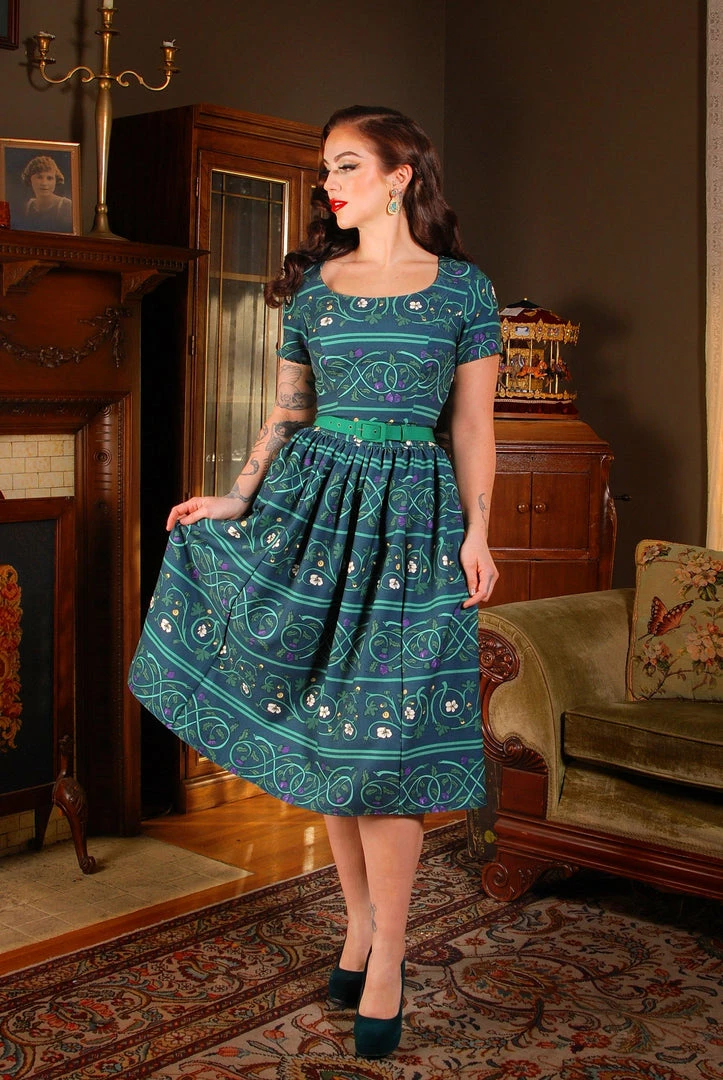 The Gena Dress in Celtic Unity is made from a lovely cotton sateen, and it features a fitted bodice with a gathered full skirt with deep pockets.Â