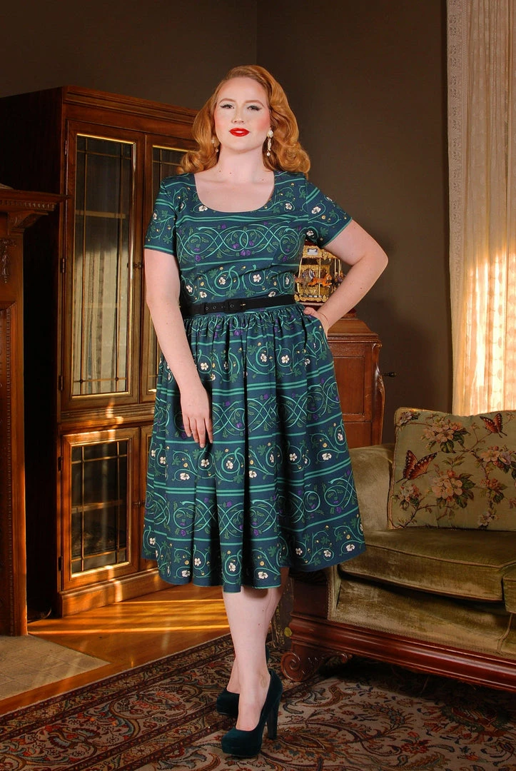 The Gena Dress in Celtic Unity is made from a lovely cotton sateen, and it features a fitted bodice with a gathered full skirt with deep pockets.