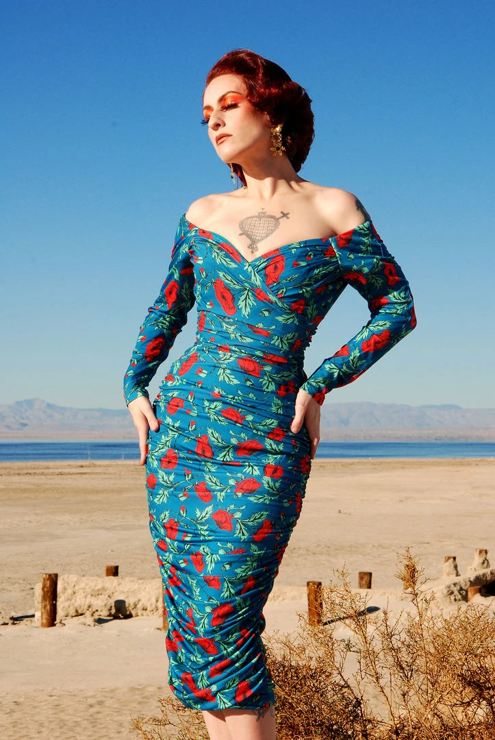 Now in our exclusive Poppies print by Hope Morrison, the Monica is a wonder of a wiggle! This PUG staple is inspired by the sexy gathered wiggle dresses of mid-century Hollywood, the beautiful crossover bustline features soft, clear elastic to hold the jersey to your skin and allows the sleeves to sit slightly off-shoulder – and may also be worn comfortably on-shoulder. The fabric is a unique matte knit that will not pill, resists wrinkles, and has beautiful drape and stretch. A built-in stretch Bengaline shaper for the bust, waist, and lower hip gives support, structure, and holds you in, while being surprisingly comfortable, while the gathered outer fabric disguises the internal structure and gives you a sleek and clean hourglass silhouette. The result is an incredibly sexy and attention grabbing wiggle dress with the structure to have you looking your best while stopping traffic and breaking hearts. Worn here with The Hot Girl Peep Toe Mule in Black Faux Leather.