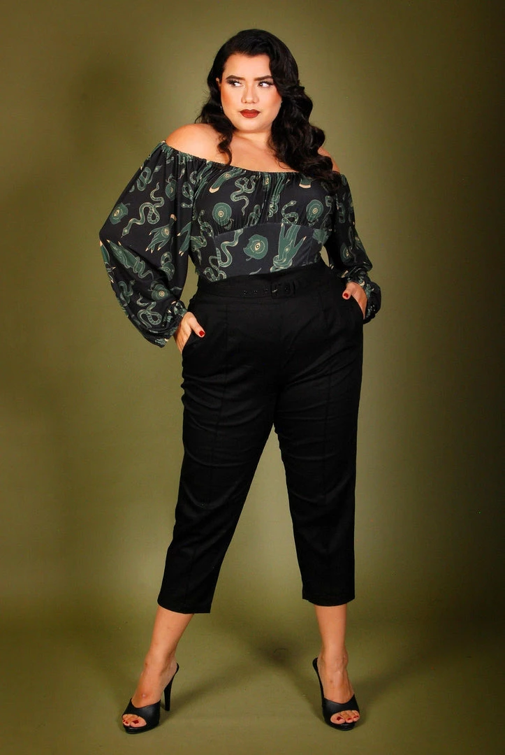 We took the flowing sleeves of our Gia Gown for added 1930’s inspired elegance and combined them with the curved bustline of our Peasant Tops to better accommodate bigger busts while also being super flattering on smaller chests. This top also features elasticized wrists, an elasticized neckline that can be easily worn on or off the shoulders, and no closures for a fuss-free pullover fit. Made from our classic stretch poly crepe, this top is made for all day comfort.Â