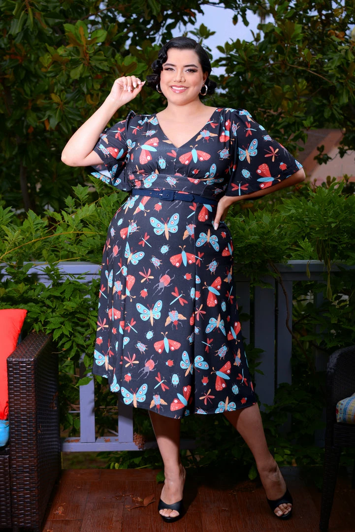 Featuring wide flowing bell sleeves and back zip, with V-neckline  that is accentuated by gathers under the bust. The fit and flare silhouette has seaming running from the base of the bust down to the hem. Lined in the bodice and skirt in comfortable knit fabric.
