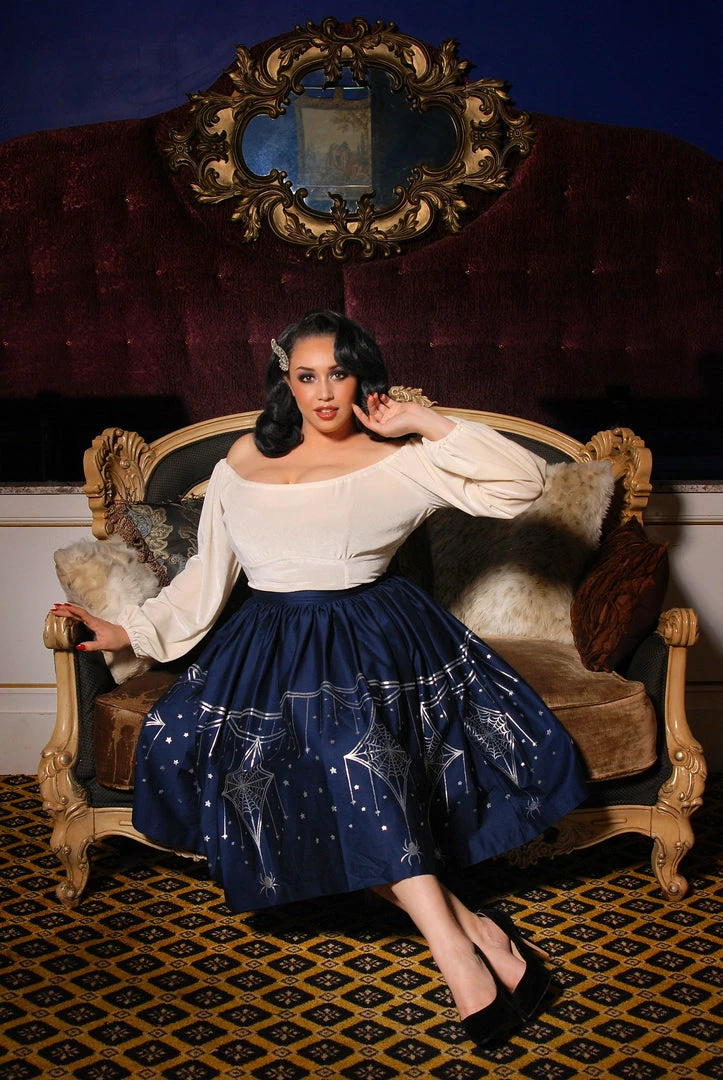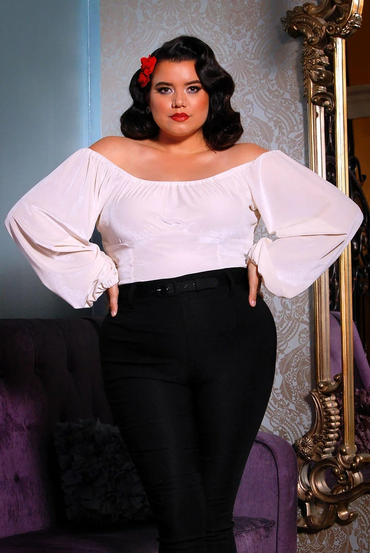 We took the flowing sleeves of our Gia Gown for added 1930’s inspired elegance and combined them with the curved bustline of our Peasant Tops to better accommodate bigger busts while also being super flattering on smaller chests. This top also features elasticized wrists, an elasticized neckline that can be easily worn on or off the shoulders, and no closures for a fuss-free pullover fit. Finally we topped it all off in sexy stretch velvet.